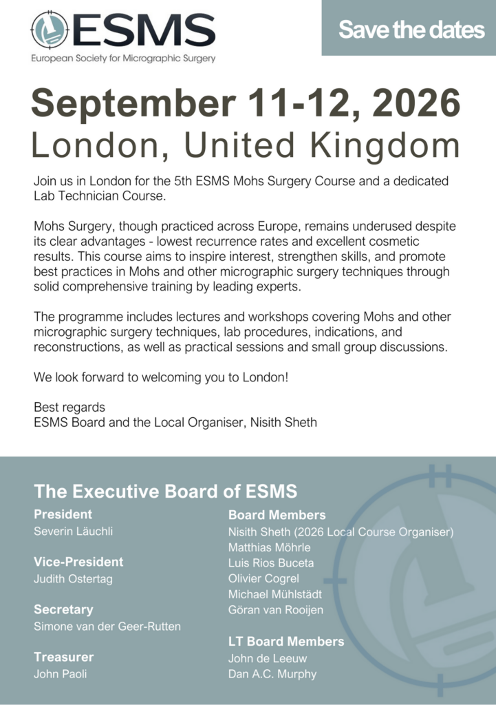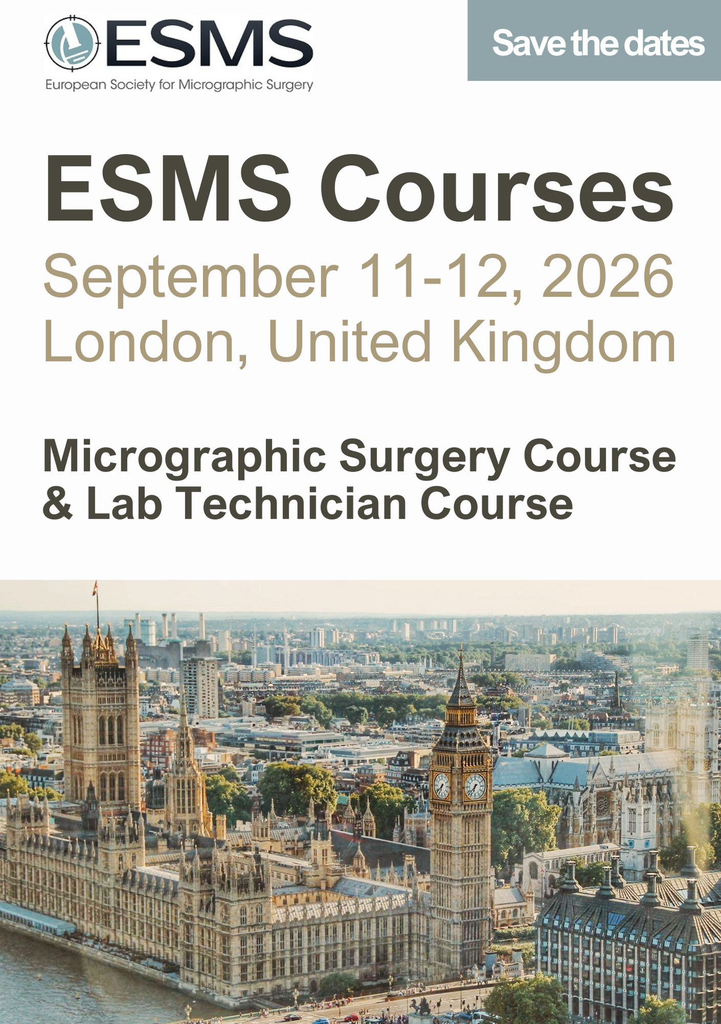 We are pleased to announce that the ESMS Mohs Surgery Course and the ESMS Lab Technician Course 2026 will take place in London on 11–12 SEPTEMBER 2026.